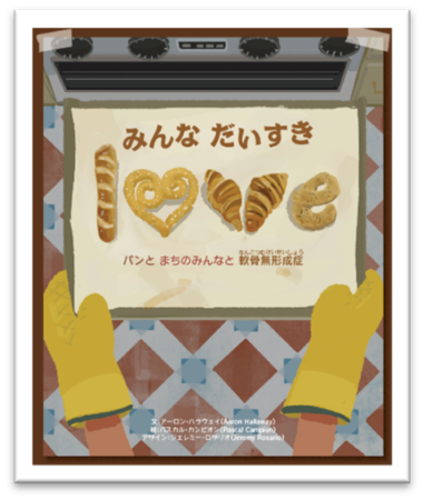 パンづくりを通じて軟骨無形成症のことを学んでいくお話を描いた絵本『Rising Love』(英語版)と