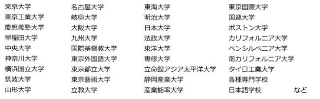 <外国人留学生の前回来場学校実績(一部抜粋、順不同)>