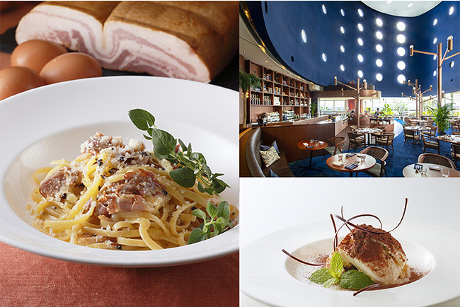 旬の茄子で伊吹ハムを包んだ「インボルティーニメランザーレ」と、「鯛のカルパッチョ」の前菜をお召し上がりいただき、パスタは濃厚なクリームと伊吹ベーコンの旨味を感じられるカルボナーラを。メイン料理には、“バームクーヘン豚”の愛称で知られる「藏尾のポークのタリアータ」か、蒸し焼きでプリっとした柔らかい食感に仕上げた「琵琶マスの包み焼き」のどちらかをお選びいただけます。お食事のデザートには、コーヒーとクリームの組み合わせが絶妙なティラミスをご用意。