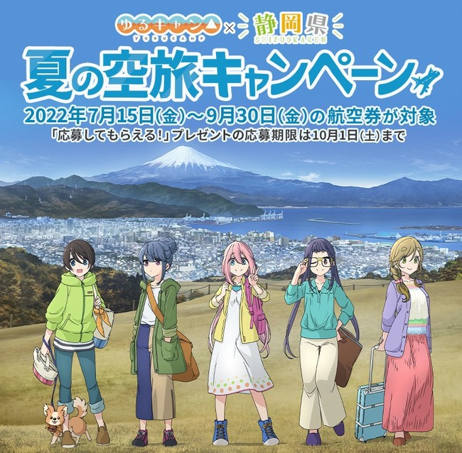 静岡県は、本県や山梨県などが舞台のキャンプをテーマとしたTVアニメーション『ゆるキャン△』シリーズとコラボレーションし、富士山静岡空港において、2022年7月15日(金)~2022年9月30日(金)まで「『ゆるキャン△』×静岡県 夏の空旅キャンペーン」を開催します。