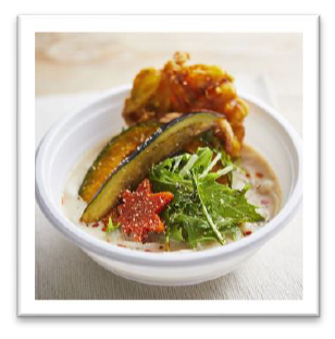 豆乳と六甲味噌のおだしは優しい味わい。白味噌や練りごまの分量を何度も変えて試しました。かき揚げと色とりどりのお野菜をトッピングし、仕上げにブラックペッパーやラー油をかけ、優しい味わいにアクセントをつけることで食欲をそそる香りになっています。