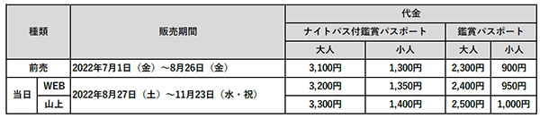 ※ナイトパス付鑑賞パスポートは有料会場への入場と、夜間作品を期間限定で公開する「ひかりの森~夜の芸術散歩~」会場への入場がセットになったパスポートです。