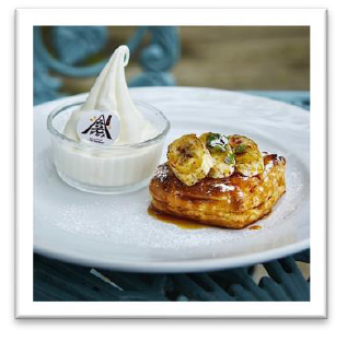 メープルシロップと味噌を混ぜたオリジナルソースは味噌のしょっぱさとシロップの甘さが、焼きバナナの香ばしさとよく合います。焼きたての温かいデニッシュと冷たいソフトクリームを一緒に食べるのもおススメ。贅沢な気分が味わえます!