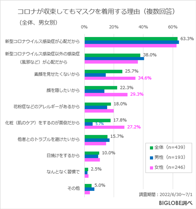 2. コロナが収束した後もマスクを着用する人は約44%。理由は「素顔を見せたくない」「顔を隠したい」