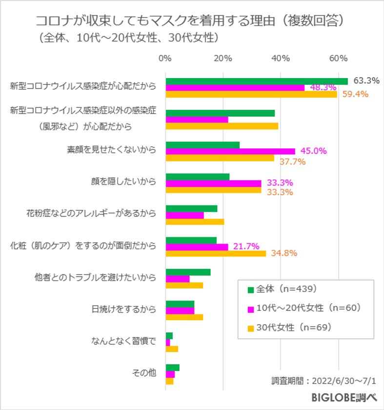 マスクを着用したいと回答した全国の10代(18歳以上)から50代の男女439人にその理由を聞いたところ、新型コロナウイルスやそれ以外の感染症の心配を除くと「素顔を見せたくないから」「顔を隠したいから」の順となった。