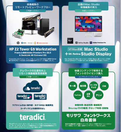 今回の展示では、Mac Studioでのアドビ映像制作システム、高解像度リモートワークTeradiciやコラボレーションツールなど、テレワーク対応やクリエイティブ制作に最適な製品をご紹介します。お客様の課題を解決するためのソリューションを体験しにぜひお立ち寄りください。