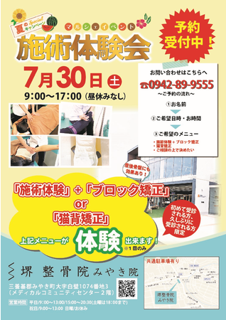 【堺整骨院 みやき院が行う「施術体験会」ポスター】