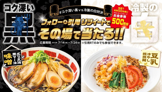 期間中、Twitterでフォロー&「#コク深い黒vs冷製の白対決」と「白」か「黒」を記載して引用ツイートすると、お食事券500円分が当たるキャンペーンを実施いたします。