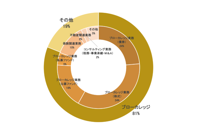 IFA回答者のメインビジネスは、全体の81%がブローカレッジだった。ブローカレッジのうち、34%が株式、24%が債券、23%が公募・私募ファンドだった。