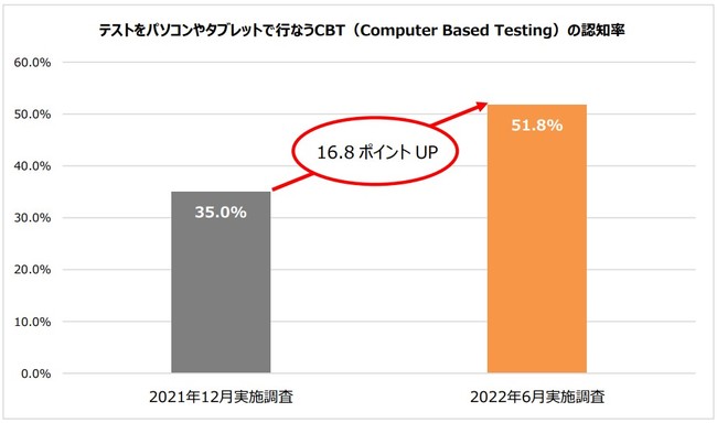 今回の調査では、教員の80%が「『CBT』を実施したい」と回答しました。加えて、CBTの認知度が50%を超え、半年で17ポイント増加していることが判明し、1人1台端末活用法の一つとして、『CBT』が大きく期待されていることが示唆されました。