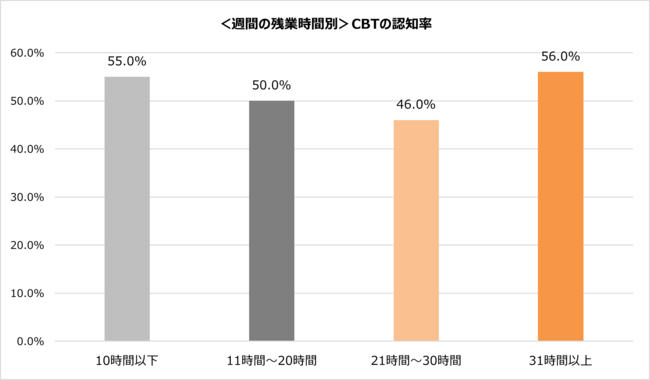 『CBT』の認知率は51.8%と、前回の調査実施時*より16.8ポイント増加していることがわかりました。残業時間別の割合をみると、残業時間の少ない層と多い層の両端で『CBT』の認知率が高い傾向にあります。