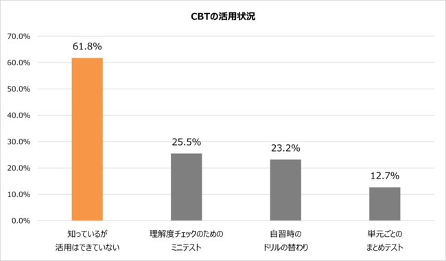 一方で、「『CBT』を認知しているものの活用できていない教員」の割合は61.8%と高く、現在の学校現場に即した、活用しやすい『CBT』システムが待たれている状況であるといえます。