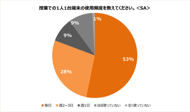授業内での1人1台端末の使用頻度について調査したところ、53.2%の教員が「毎日使用している」と回答したほか、「週2~3日使用している」と回答した人を合わせると、80%以上の教員が日常的に端末を活用できていることが判明しました。一方で、「週1日以下」と回答した教員はわずか19.3%にとどまり、前回調査時*の約30%と比べると、配備直後から顕著であった端末活用の格差が是正されてきたといえます。