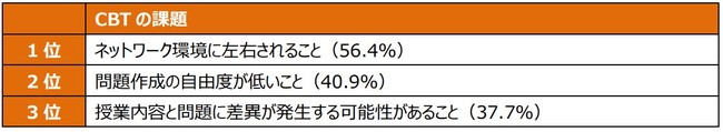 一方で、『CBT』の課題としては、「ネットワーク環境に左右されること」が56.4%と最も多く、「問題作成の自由度が低いこと」や「授業内容と問題に差異が発生する可能性があること」も挙げられており、学校現場や教員の実態に寄り添った『CBT』の必要性が高まっています。