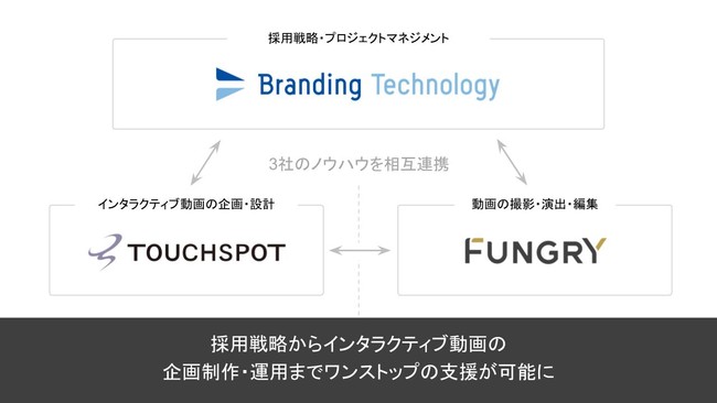 採用の全体戦略設計をブランディングテクノロジー株式会社、インタラクティブ動画の企画設計をタッチスポット株式会社、動画の撮影・演出・編集を株式会社ファングリーが担当し、企業の採用課題解決につながるサービス提供を行います。