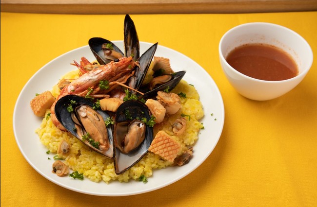 福井の魚介を使用した色彩豊かなパエリア。オリジナルのソースをかけて味変して楽しめます。