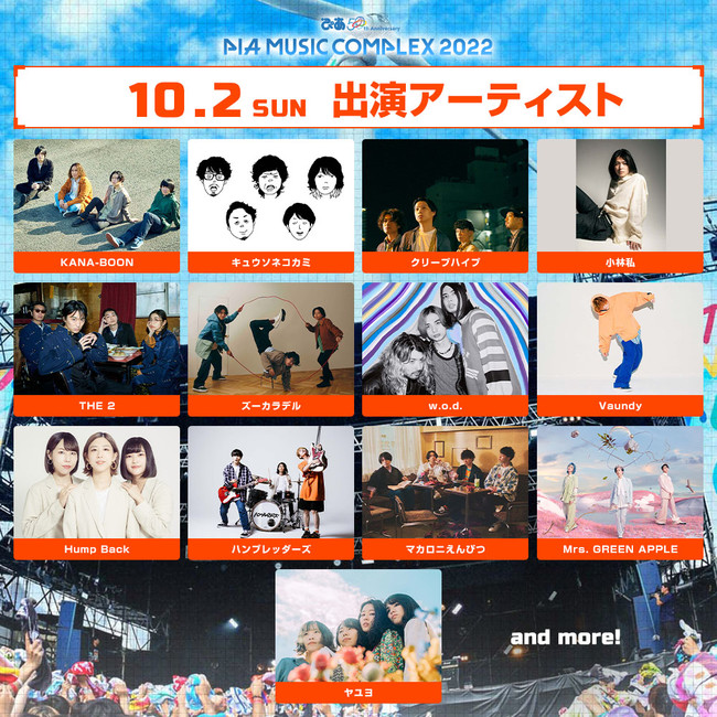 2022年10月1日(土)・2日(日) 、東京・新木場 若洲公園にて「ぴあ50thAnniversary PIA MUSIC COMPLEX 2022」を開催。本日、第2弾出演アーティストと日程別出演者を発表いたします。