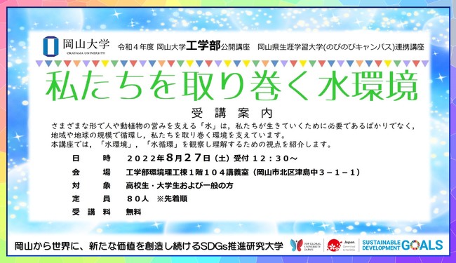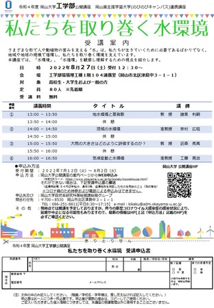 【岡山大学】工学部公開講座「私たちを取り巻く水環境」〔8/27土,13:00~16:50〕
