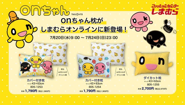 昨年11月からパーカー、ロングTシャツ、Tシャツと、onちゃんグッズを続々販売してきたファッションセンターしまむらから「onちゃんの枕」が登場!今年25周年を迎えたHTBのマスコットキャラクター「onちゃん」ですが、枕は初めてのアイテムとなります。