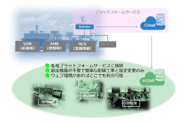・ プラットフォームサービスからデータを取得することにより、船舶へ機器を追加で設置することなく簡単な配線工事と設定変更のみで利用可能です。また、クラウドサービスのため、ウェブ環境があればどこからでも接続できます。