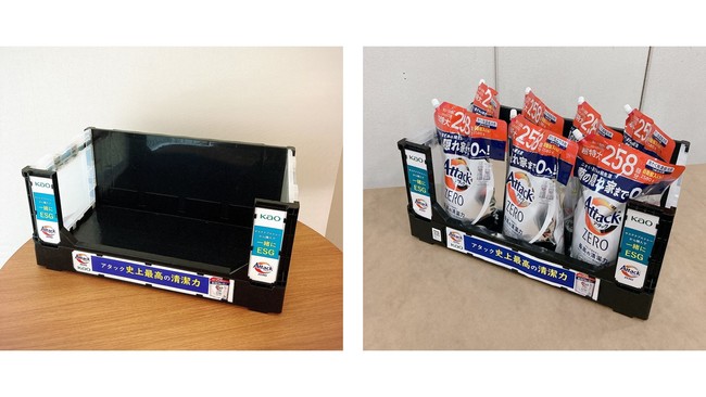 そこでこのたび、花王とコストコは協働し、繰り返し使用可能な折りたたみコンテナをテスト導入、それを回収・再利用する取り組みを開始します。また、両社で「納品」「陳列」「販売」などさまざまな場面における折りたたみコンテナの効果検証を実施し、折りたたみコンテナを活用することの利点と課題を抽出。今後は、検証結果をもとに、まずは導入店舗の拡大を図るとともに、将来的には業界全体での循環型折りたたみコンテナの標準化をめざしてまいります。