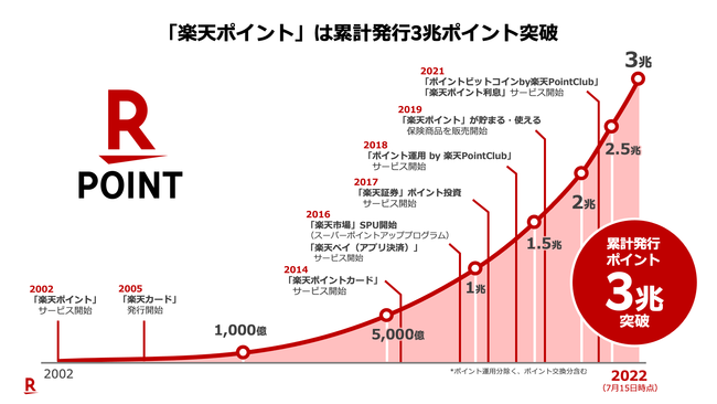 楽天グループ株式会社(以下「楽天」)は、提供するポイントプログラム「楽天ポイント」の累計発行ポイント数が、このたび3兆ポイントを突破しました(注1)。楽天グループ内での各キャンペーン施策の継続実施や、オフライン消費の回復、各種サービス利用の活発化などにより、2.5兆ポイント突破から約11カ月で5,000億ポイントの発行となりました。