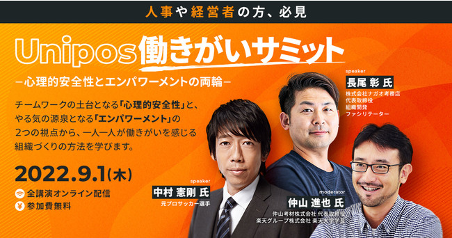 心理的安全性を高め、挑戦できる風土をつくるHRテック事業「ピアボーナス(R)︎Unipos」(以下、Unipos)を提供するUnipos株式会社(本社:東京都渋谷区、代表取締役社長CEO:田中弦)は、2022年9月1日(木)に「Unipos働きがいサミット~心理的安全性とエンパワーメントの両輪~」をオンラインで開催します。元サッカー日本代表 中村憲剛氏をゲストに、中村氏が帯コメントを書いた書籍『アオアシに学ぶ「考える葦」の育ち方: カオスな環境に強い「頭のよさ」とは』の著者・楽天大学 学長 仲山進也氏がモデレーターを務めるセッションなど全4講演を用意。一人ひとりが働きがいを感じる組織づくりの方法を学べるイベントです。