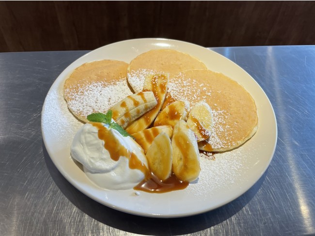 ほろ苦い甘さの濃厚なキャラメルソースがアクセントになるバナナとキャラメルのパンケーキ!