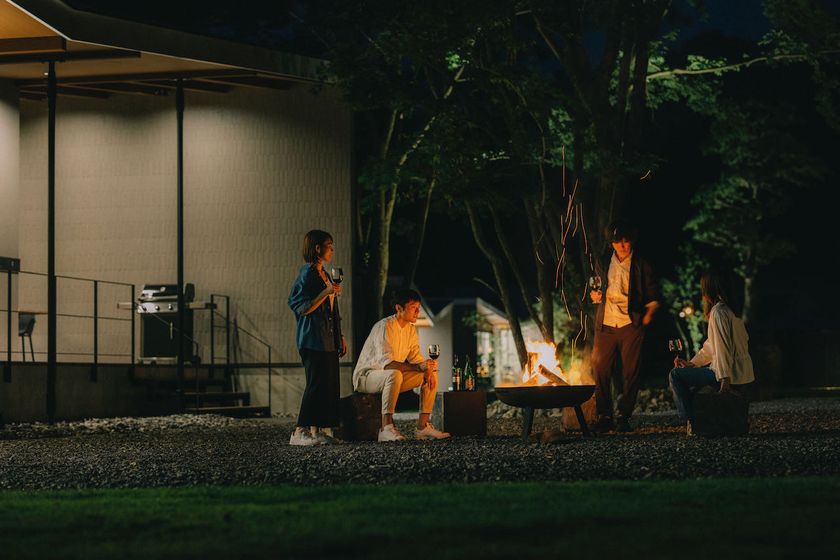 針葉樹の森に囲まれた約2,000坪の敷地を贅沢に3組限定で貸し切る貸別荘。山の清らかな空気の中、バーベキューや焚き火などを楽しむことができます。