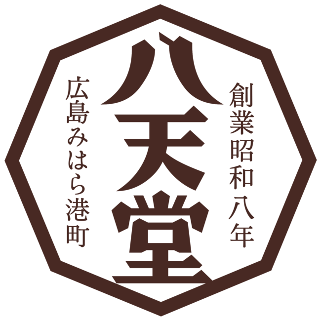 八天堂の八角形と、お堂と栗の木のカラーのブラウンをデザインに創業昭和八年・広島みはら港町と記載。八天堂の「八」、創業昭和八年の「八」、八角形の「八」、末広がりで縁起の良い漢字の「八」。「八」は八天堂にとって縁深く大切にしている数字です。