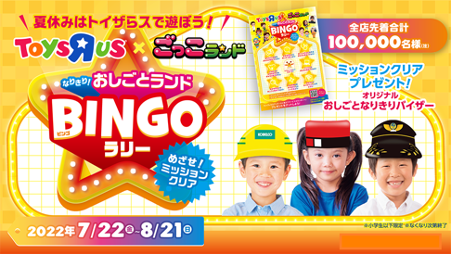 2022年7月22日(金)から8月21日(日)の期間に、国内のトイザらス、ベビーザらス店舗で小学生以下のお子様を対象にビンゴラリーカードが配布されます。カードに記載されたミッションを店内でクリアしビンゴすると、『ごっこランド』に登場する実在する企業をモチーフにした「オリジナルおしごとなりきりバイザー」がプレゼントされます。
