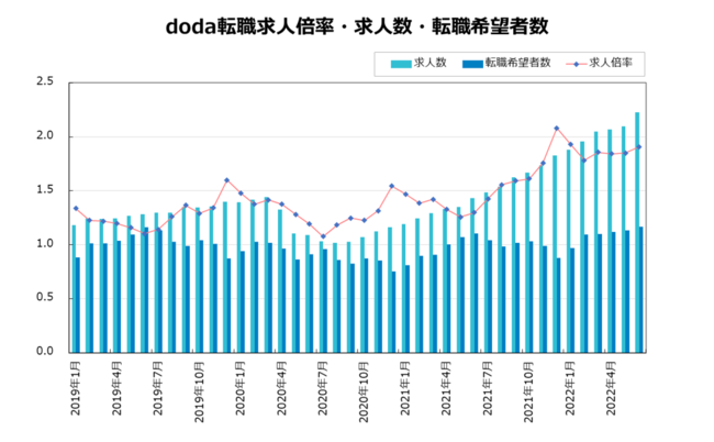 doda転職求人倍率2022年6月は1.91倍(前月差+0.06ポイント)