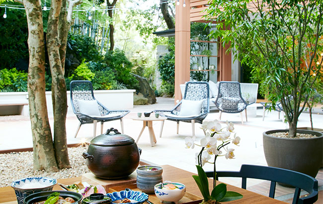 料亭「白雲閣」開業から72年、緑豊かな都会の森のくつろぎと、伝統を受け継ぎモダンに和食を提供する「茶寮リビエラの庭」。