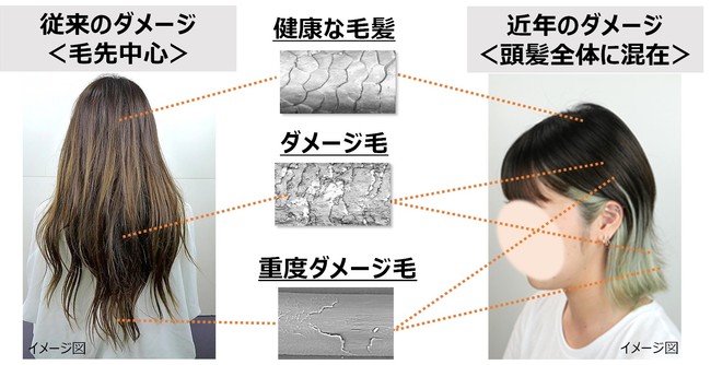 健康な毛髪は表面がキューティクルで覆われていますが、ダメージによってキューティクルの剥がれ(ダメージ毛)や消失(重度ダメージ毛)が起こります。今まで主流だった髪全体へのカラーリングでは、毛先に向かうほどダメージが大きい傾向でしたが、昨今インナーカラーなどが流行し、そのような髪では重度ダメージ毛が内側や顔周りにも発生し、髪全体にダメージレベルの異なる毛髪が混在することがわかりました(図1)。