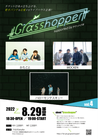 チケットぴあが立ち上げた若手バンド応援企画「Grasshopper supported by チケットぴあ」。 8月開催の「Grasshopper vol.4」に、 ハローモンテスキュー、かたこと、MOCKENの3組の出演が決定した。