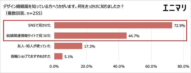 “デザイン婚姻届” を知っている方へ、何をきっかけに知ったかをたずねたところ、「SNSで見かけた」との回答が72.9%で最多となり、多くの花嫁が、SNSで他のカップルの事例を参考にしていることがわかりました。次いで「結婚関連情報サイトで見つけた」が44.7%となりました。