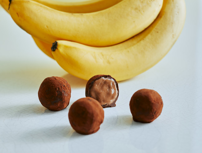 バナナのフレッシュさを表現するために、生のバナナをピューレにし、まろやかな甘みのミルクチョコレートとアーモンドミルクを加えて味わいに深みを出しました。薄いミルクチョコレートのコーティングと、中からとろけ出す瑞々しいショコラの食感も楽しい一品です。
