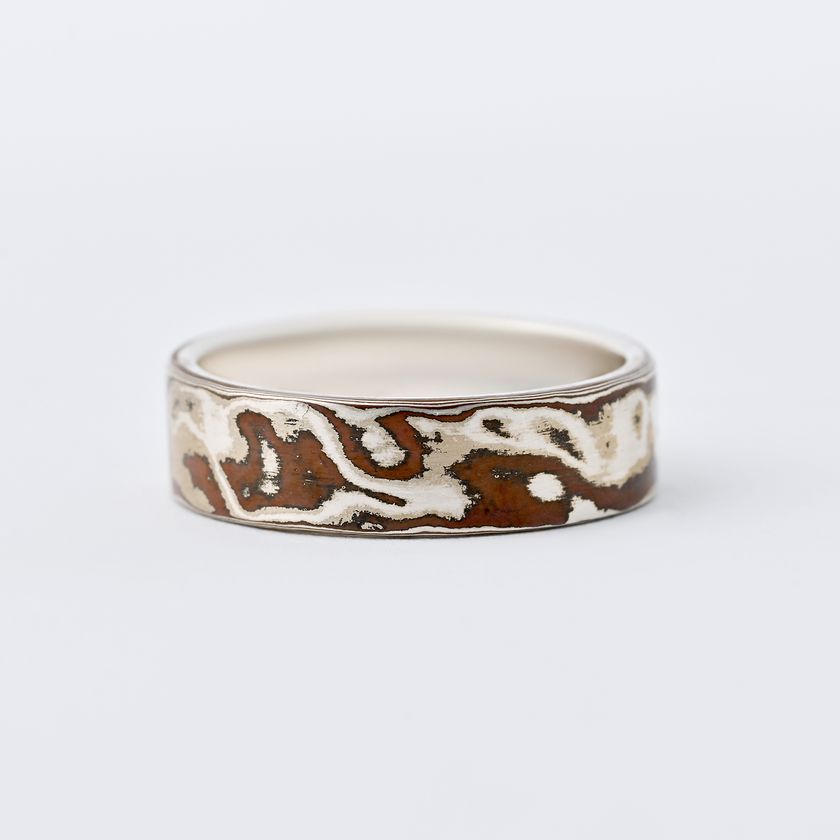 江戸時代に生まれ、日本の伝統技術として世界にも知られている木目金。異なる地金を複数組み合わせて木目のような模様を作り出す技法で、二つとして同じ表情を作ることができません。