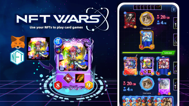 『NFTWars』は、手軽にNFTプロジェクトにゲームのユーティリティを付与できるサービスです。ユーザーはウォレットで所有するNFTを使用し、様々なNFTプロジェクトのカードゲームで遊ぶ世界の実現を目指します。