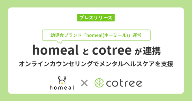 オンラインカウンセリング事業を展開する株式会社cotree(本社:東京都中央区、代表取締役:西岡 恵子、以下「cotree」)は、“幼児食の悩みをゼロに。”を目指す幼児食ブランド「homeal(ホーミール)」を運営するhomeal株式会社(本社:東京都渋谷区、代表取締役:鬼海 翔、以下「homeal」) と2022年7月27日(水)より連携を開始しましたことをお知らせいたします。