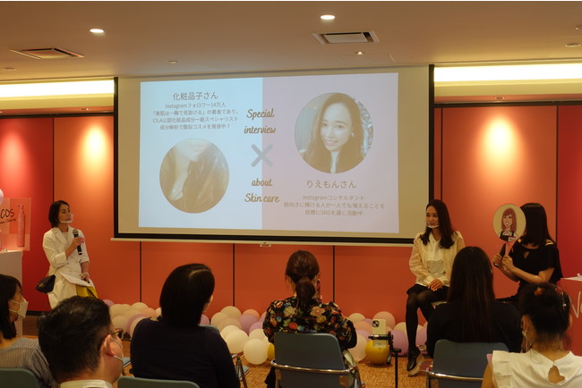 13:30からスタートした、「りえもんさんと化粧品子さんによる1日限りのスペシャル対談」では、商品を発売するに至る経緯や苦労話などが語られ、対談の様子は明色化粧品公式インスタグラムアカウント、りえもん氏のアカウント、化粧品子氏のアカウントでも同時にライブ配信されました。来場者とライブ視聴者の合計数はピーク時には200名以上にもなり、各アカウントに多くのコメントが寄せられました。