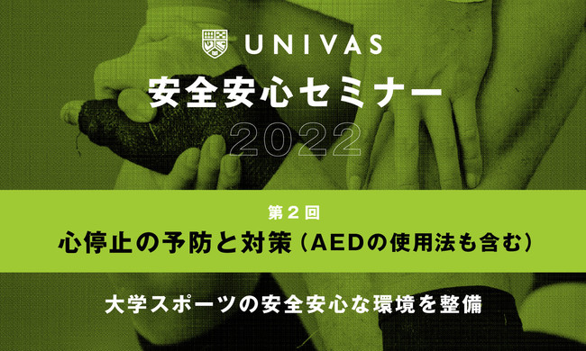 一般社団法人大学スポーツ協会(所在地:東京都千代田区、会長:福原紀彦、以下 UNIVAS)は、安全安心な大学スポーツの環境を整備するために、怪我や故障などのリスクを減らし、重篤事故を事前に予防や対策することでアスリート活動を充実させ、ベストなパフォーマンスにつなげられるように「安全安心セミナー」を開催しております。第一回は、夏場に起こりやすい「熱中症」をテーマに実施いたしました。第二回目は、様々なスポーツ種目の活動で起こり得る心停止による心臓突然死の予防と対策について、AEDの活用法も含めたセミナーを8月30日に開催いたします。