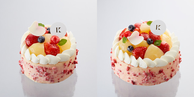 イチゴと白桃のソースをサンドし、フリーズドライイチゴ入りのホワイトチョコを塗ったスポンジで包み、イチゴやピーチ、フランボワーズ、ブルーベリーをのせました。