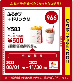 ●内容:商品裏面のクーポン券を切り取って、全国のロッテリア店舗に持参すると、対象商品を割引価格で購入できます(一部お取り扱いのない店舗もございます)。他の割引サービスとの併用はできません。