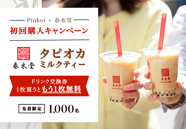 今年、3月に実施したPinkoi × 春水堂のコラボレーションが大好評につき、再度コラボレーションが実現しました。今回は、Pinkoiでの購入が初めての方を対象に、「タピオカミルクティー」ドリンク交換券を1枚購入で、もう1枚が無料でもらえるというもの。