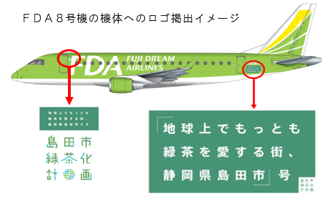 日本一の大茶園の牧之原台地を有する静岡県島田市は、「島田市緑茶化計画」と題したシティプロモーション活動を展開しており、このたび、株式会社フジドリームエアラインズ(略称:FDA、本社:静岡県静岡市、代表取締役社長:楠瀬 俊一)とネーミングライツ契約を締結し、ティーグリーン色のFDA8号機(JA08FJ)を「地球上でもっとも緑茶を愛する街、静岡県島田市」号と命名します。