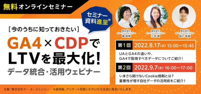 “おもてなしを科学する”株式会社イー・エージェンシー(本社:東京都千代田区、代表取締役:甲斐真樹)は、「今のうちに知っておきたいGA4×CDPでLTVを最大化!データ統合・活用ウェビナー」を8/17(水)、9/7(水)の2回に渡り開催いたします。