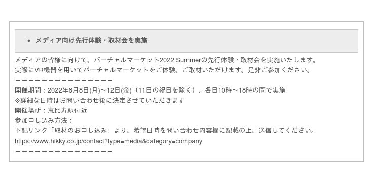株式会社HIKKY(本社:東京都渋谷区、代表取締役:舟越靖)は、2022年8月13日(土)から28日(日)にメタバース上で開催される世界最大※のVRイベント『バーチャルマーケット2022 Summer』の出展企業第2弾として、新たに決定した各企業のブース内容及び企業ブースが出展される会場の詳細を発表いたします。