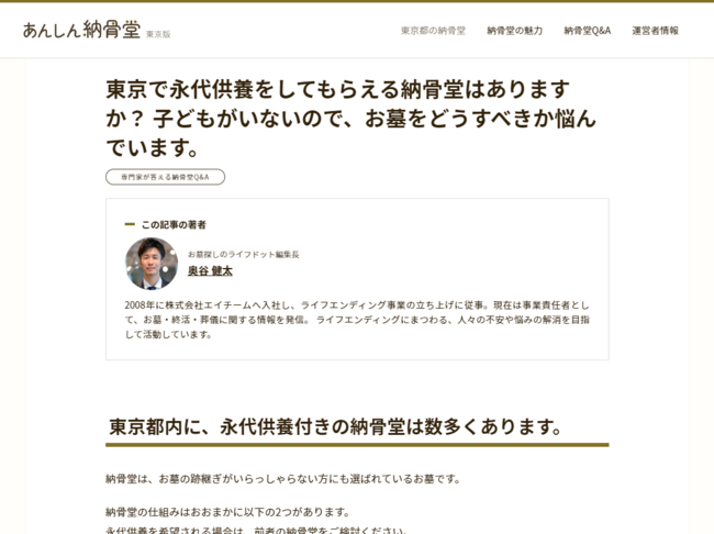 株式会社エイチームのグループ会社である株式会社エイチームライフデザイン(本社:愛知県名古屋市、代表取締役:間瀬文雄)が運営するお墓選びの支援サービス「ライフドット(Life.)」は、屋内墓苑の受託販売を行う株式会社はせがわ(本社:東京都文京区、代表取締役:新貝三四郎)と共同監修の元、 “納骨堂”の専門サイト『あんしん納骨堂 東京版』を8月2日から公開しました。(https://www.noukotsudou-tokyo.jp/)