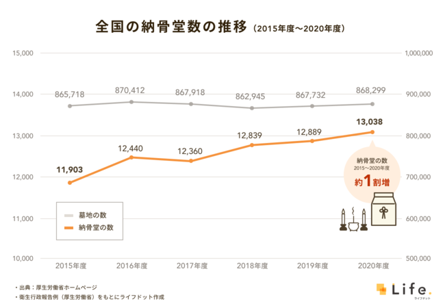 厚生労働省が公表している統計データによると、全国の墓地数は横ばいの状態が続く中、納骨堂は年々増加していることがわかります。